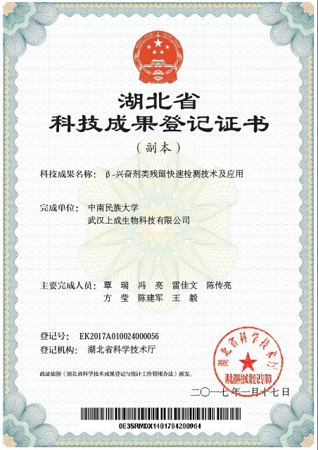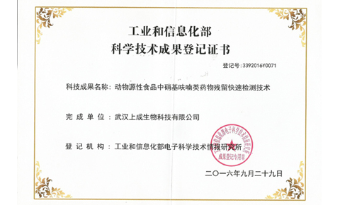 2016年9月27日,武漢上成生物科技有限公司研究成果“動(dòng)物源性食品中硝基呋喃類(lèi)藥物殘留快速檢測(cè)技術(shù)”通過(guò)國(guó)家科技部科研技術(shù)成果評(píng)價(jià)。