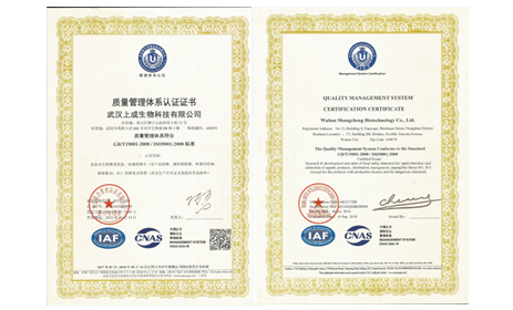 2016年7月6日,武漢上成生物科技有限公司通過(guò)了ISO9001:2008質(zhì)量管理體系的認(rèn)證,并順利取得證書(shū)。