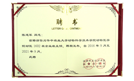 上成生物總經(jīng)理陳建軍同志被華中農(nóng)業(yè)大學(xué)動(dòng)物科學(xué)技術(shù)學(xué)院動(dòng)物醫(yī)學(xué)院聘請(qǐng)為1602班企業(yè)班主任,聘期五年。