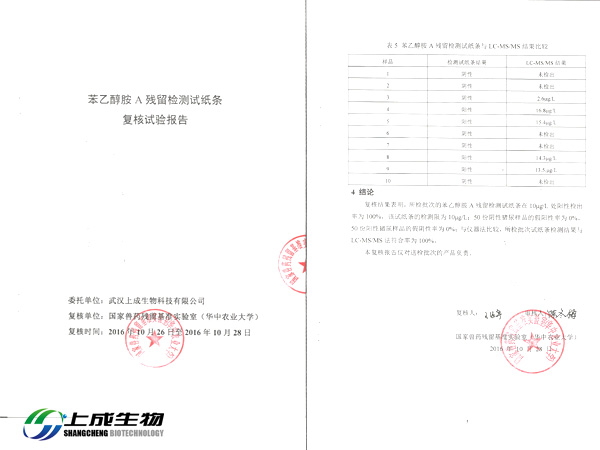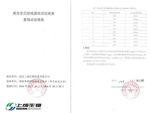 2016年10月26日,上成生物將苯乙醇胺A殘留檢測試紙條、克倫特羅殘留檢測試紙條、萊克多巴胺殘留檢測試紙條和沙丁胺醇殘留檢測試紙條四款膠體金檢測試紙條送到國家獸藥殘留基準實驗室(華中農(nóng)業(yè)大學)做復核實驗。實驗內(nèi)容包括:檢測限、假陽性率、假陰性率和儀器對比。經(jīng)過實驗檢測產(chǎn)品全部達到國家標準。