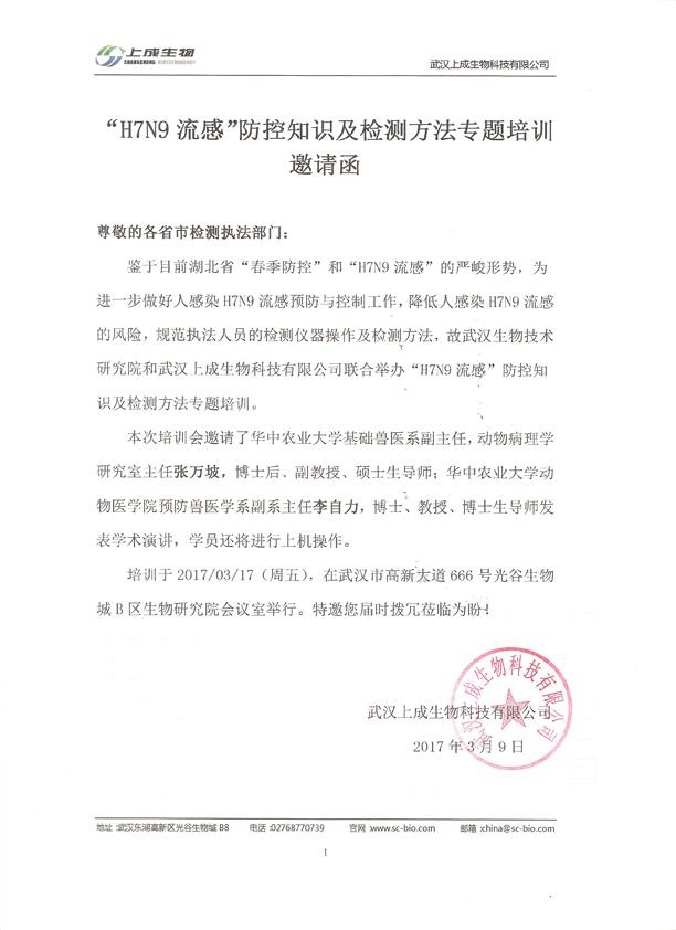 鑒于目前湖北省“春季防控”和“H7N9流感”的嚴峻形勢,為進一步做好人感染H7N9流感預防與控制工作,降低人感染H7N9流感的風險,規(guī)范執(zhí)法人員的檢測儀器操作及檢測方法,故武漢生物技術(shù)研究院和武漢上成生物科技有限公司聯(lián)合舉辦“H7N9流感”防控知識及檢測方法專題培訓。