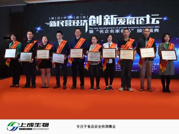 上成生物受邀參加武漢中小企業(yè)新民營經(jīng)濟創(chuàng)新發(fā)展論壇暨“名企名家名品”頒獎盛典,其“硝基呋喃類快速檢測試劑”榮獲2017年度名優(yōu)產(chǎn)品。產(chǎn)品原理是樣品中硝基呋喃類代謝物經(jīng)衍生處理后,其衍生物與膠體金標(biāo)記的特異性抗體結(jié)合,抑制抗體和檢測卡/試紙條中檢測線(T線)上硝基呋喃類代謝物-BSA偶聯(lián)物的免疫反應(yīng),從而導(dǎo)致檢測線顏色深淺的變化。通過檢測線與控制線(C線)顏色深淺比較,對樣品中硝基呋喃類代謝物進行定性判定。